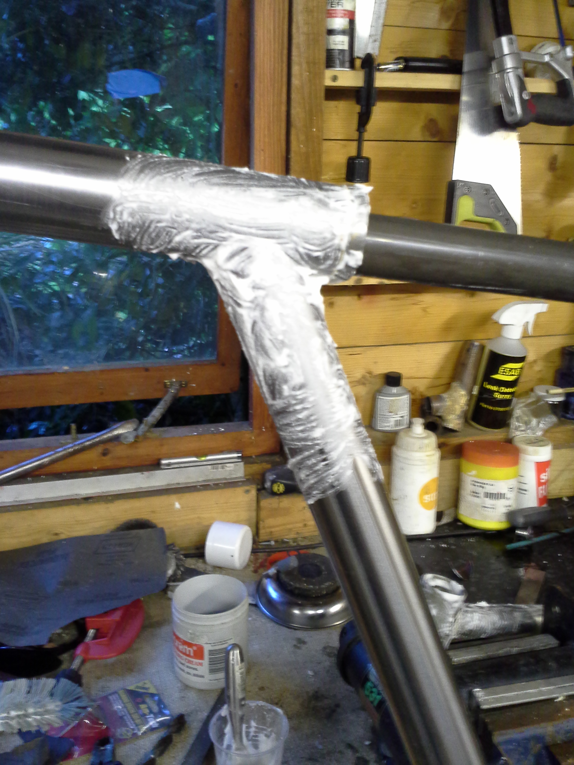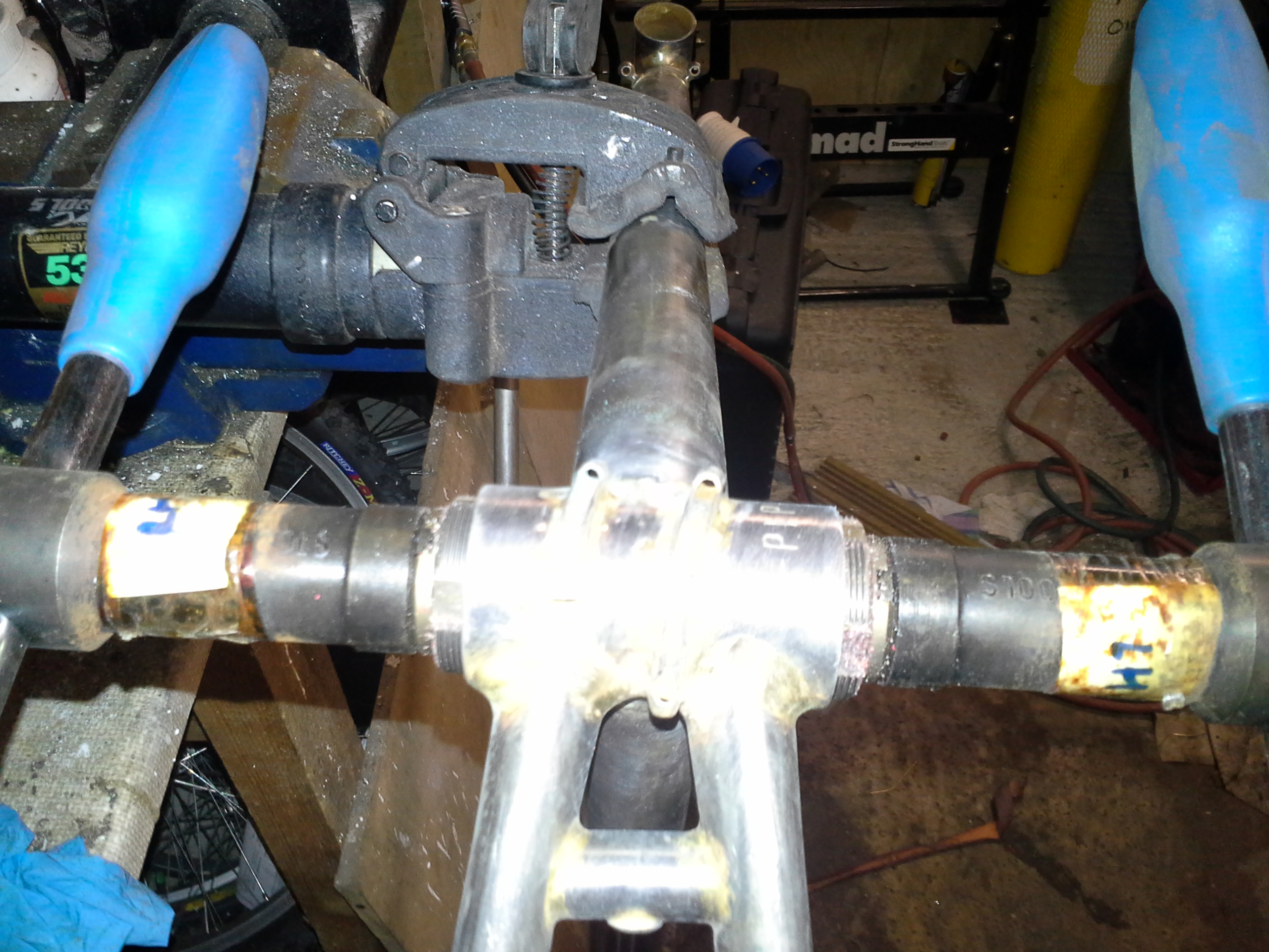 The preparation it sand the outside and inside of the frame. The wipe down with Propanol. The bottom bracket needs a 15mm vent hole. then its time to set it up on the bench to get it square slide it all half off the bench so there is room the weld and tack it and check it. Then get the whole joint warm then wet it in outside to inside, then check it.