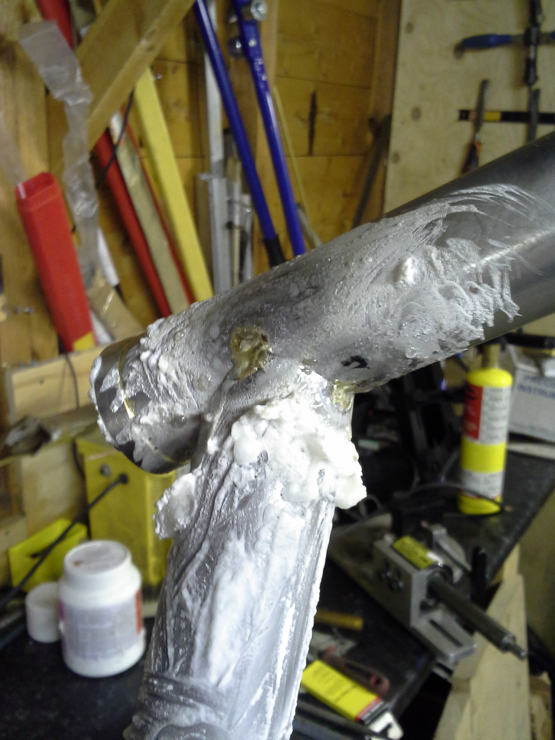 Right now it’s time to do the most important joint, head tube down tube. The angle has been check on both the angle and on the drawing. Then you need to set up the joint and weight it and flux it.