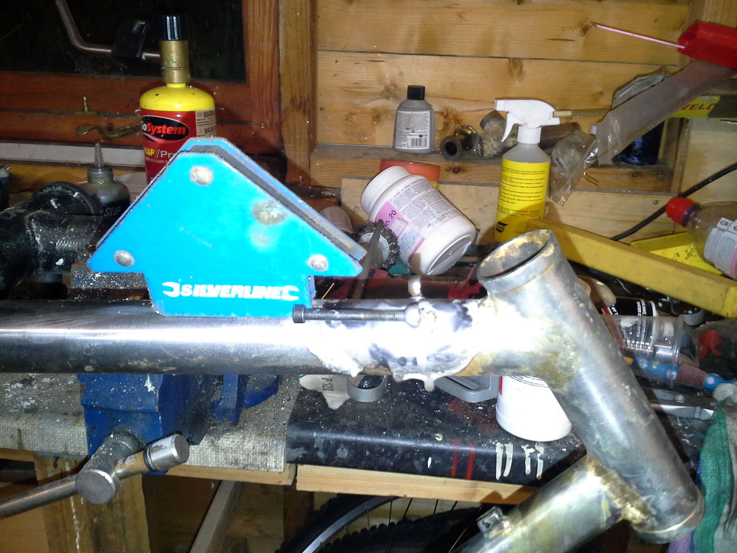 Now on to Braze-on’s. I should have mentioned that is did the bottle braze on earlier as you have to drill the tubes before you assemble otherwise you can fit a drill in easily. So the next braze on are the STI stops. These you can put a long 5m bolt in and then use a welding magnet to hold them straight. Silver solder on these as the butts are short and the tubes are thin.