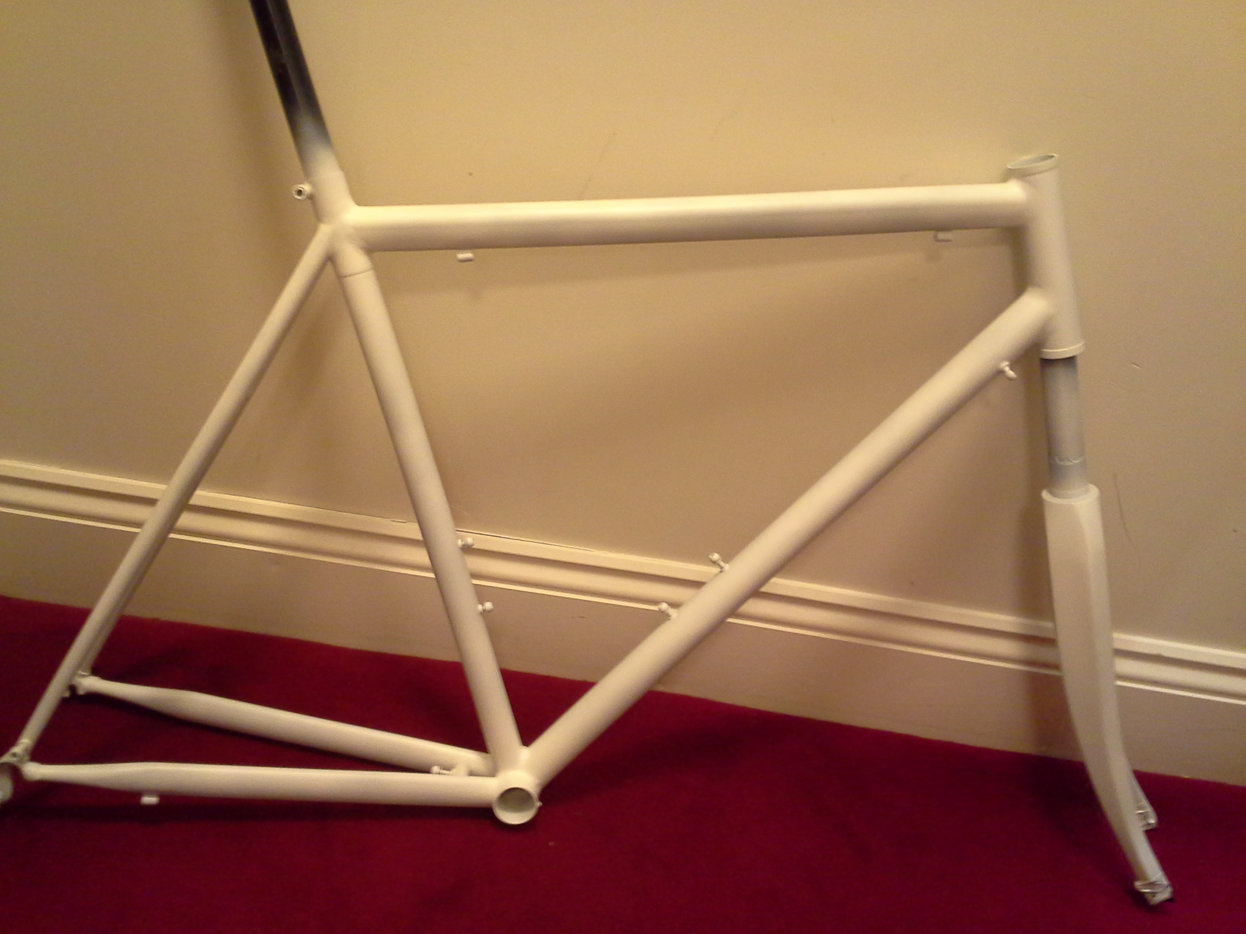 Before you paint make sure you have enough space. indoors is better and you needs to ensure no dust and good temperature of 18-20 degrees c. I am using a 3hp compressor with a water trap and high pressure low volume air gun like you would use for car paint touch ups. Make sure you have solvent ready to clean the gun before you start. Before you put any paint down make sure you have inspected the frame. blank of any threads you don’t want pain on then key it by sanding with a fine paper all over. and wipe it down the solvent (isoprop alcohol with do or paint solvent), i use a seat pin clamped into a park stand to hold it. I am using a 1k primer wetted out with solvent to a skimmed milk consistency, mix thoroughly a load the gun. then it time to paint with long light strokes until the frame is covered. i like to dust it a few time until here is enough paint to make a smooth surface, go to fare and you get a run. Aim at the hard areas first like dropout , bb and seat tube. You should end up with a fine white surface all over. leave to cure in a warm place (airing cupboards are perfect).