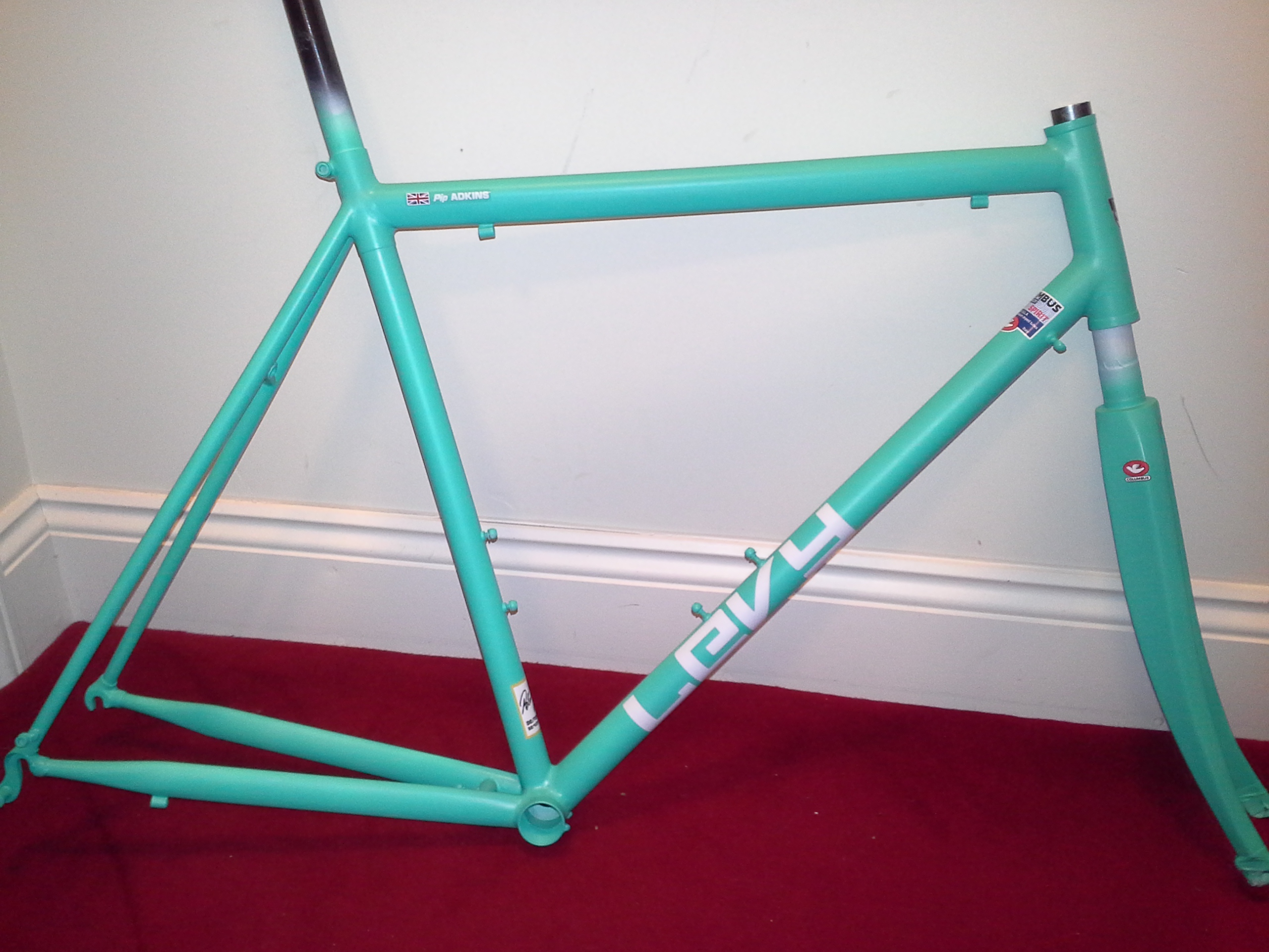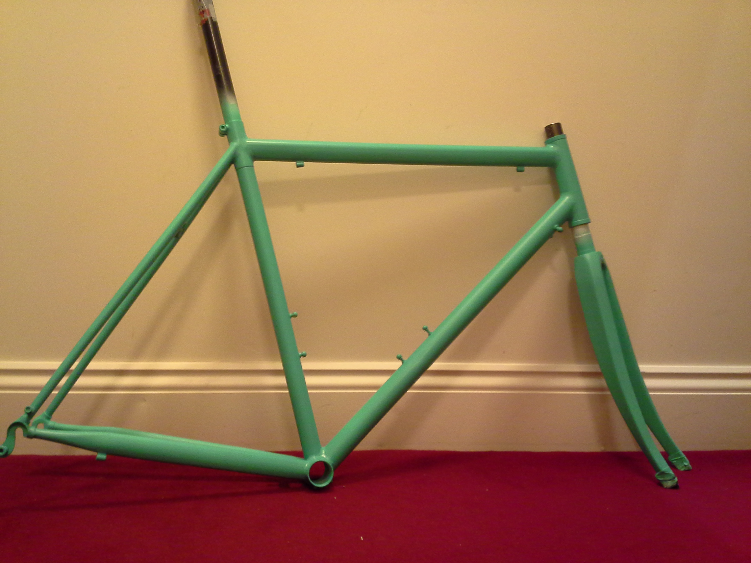 Right a custom bike needs a custom paint job. Le Sportif has a lovely livery of a light green and pastel pink pallets with white font. So the frame as per the design needs to be Green. or specifically Hex 65BBA3 which has not RAL colour and the nearest Pantone is 3258C. But the bottom line is there is not off the shelf paint that works. I have tried ordering premixed paint for the UK but they were about £60 and now the post wont ship them because of the solvent. Nice.